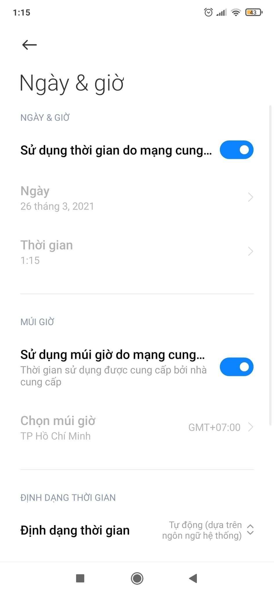 Trên điện thoại bạn cũng tìm đến chỗ cài đặt ngày giờ và tắt múi giờ do nhà mạng cung cấp sau đó chuyển thành múi giờ GMT-7.