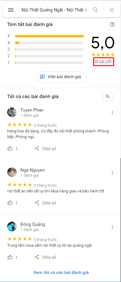 VỚI MỘT CHIẾN LƯỢC SEO ĐỊA ĐIỂM TRÊN GOOGLE MAPS, SẼ RẤT KHÓ NẾU BẠN KHÔNG CÓ NHỮNG BÀI VIẾT ĐÁNH GIÁ 5 SAO CHO DOANH NGHIỆP. CÀNG NHIỀU LƯỢT REVIEW TỐT CÀNG HỮU HIỆU ĐỂ ĐƯA ĐỊA ĐIỂM LÊN TOP GOOGLE MAPS NHANH NHẤT. KHÔNG CÓ NHỮNG BÀI VIẾT 5 SAO NÀY SẼ RẤT KHÓ THUYẾT PHỤC KHÁCH HÀNG CHỊU BỎ TIỀN RA MUA HÀNG HAY SỬ DỤNG DỊCH VỤ CỦA BẠN.